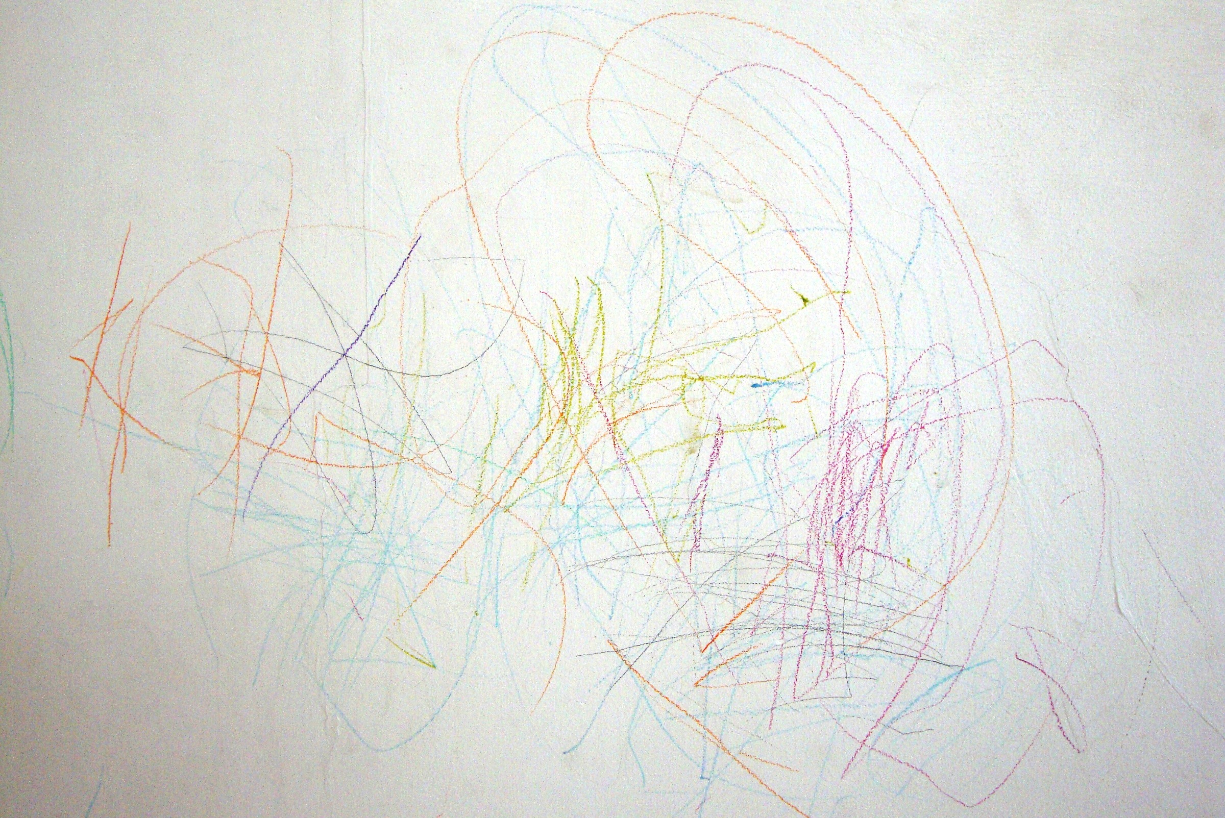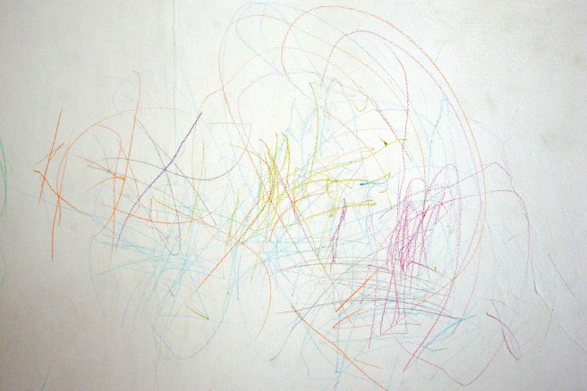 Non – washable colour crayons, on white wall.