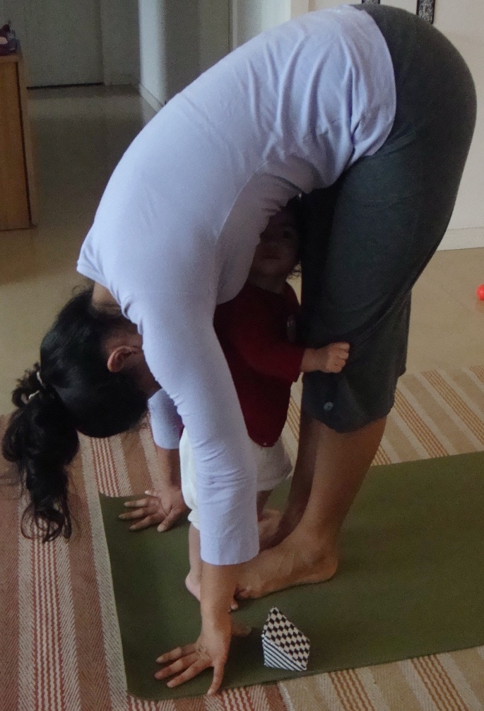 My little assistants laying on my back in forward bends like Paschimattanasana or Seated forward bend as in the photo on the left, and Baddha konasana or Bound angle pose.